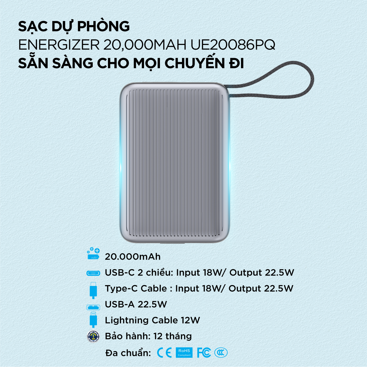 Một chiếc sạc dự phòng dung lượng lớn là người bạn đồng hành không thể thiếu cho những ai thường xuyên di chuyển hoặc sử dụng thiết bị di động với cường độ cao. Energizer UE20086PQ là giải pháp hoàn hảo cho mọi chuyến bay, mang đến dung lượng khủng 20,000mAh, công nghệ sạc nhanh tích hợp dây cáp tiện lợi cùng các chứng nhận chuẩn hàng không quốc tế bổ sung thêm CCC . Cùng khám phá chi tiết về UE20086PQ đến từ thương hiệu nổi tiếng toàn cầu Energizer hơn 125 năm trên thị trường.