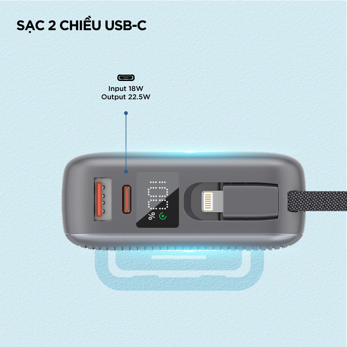 1 cáp USB-C 22.5W, 1 lightning 12W tích hợp sẵn, không cần mang theo dây rườm rà